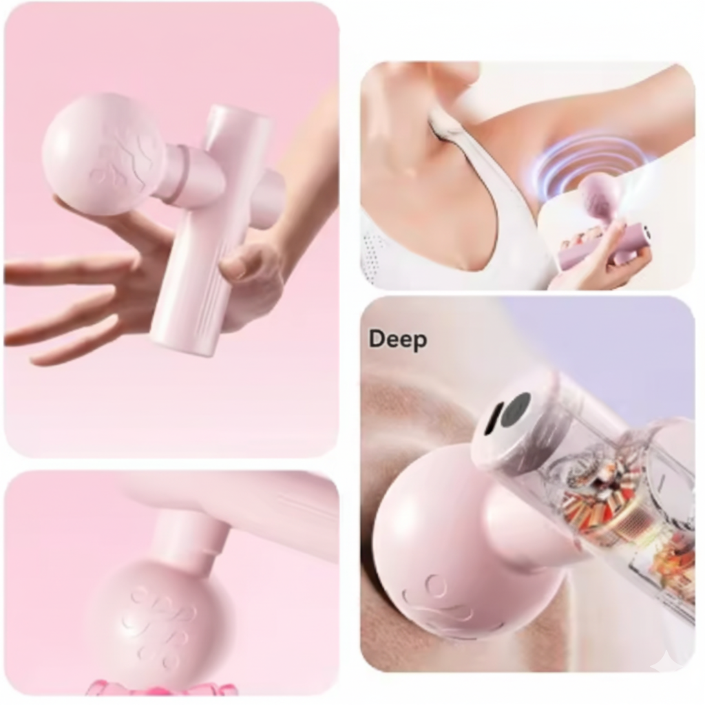 Experience professional-grade muscle relief in the palm of your hand. This compact, lightweight massage gun delivers powerful deep-tissue therapy to relax tension, improve circulation, and soothe sore muscles after every workout or long day — all with a gentle, feminine touch.